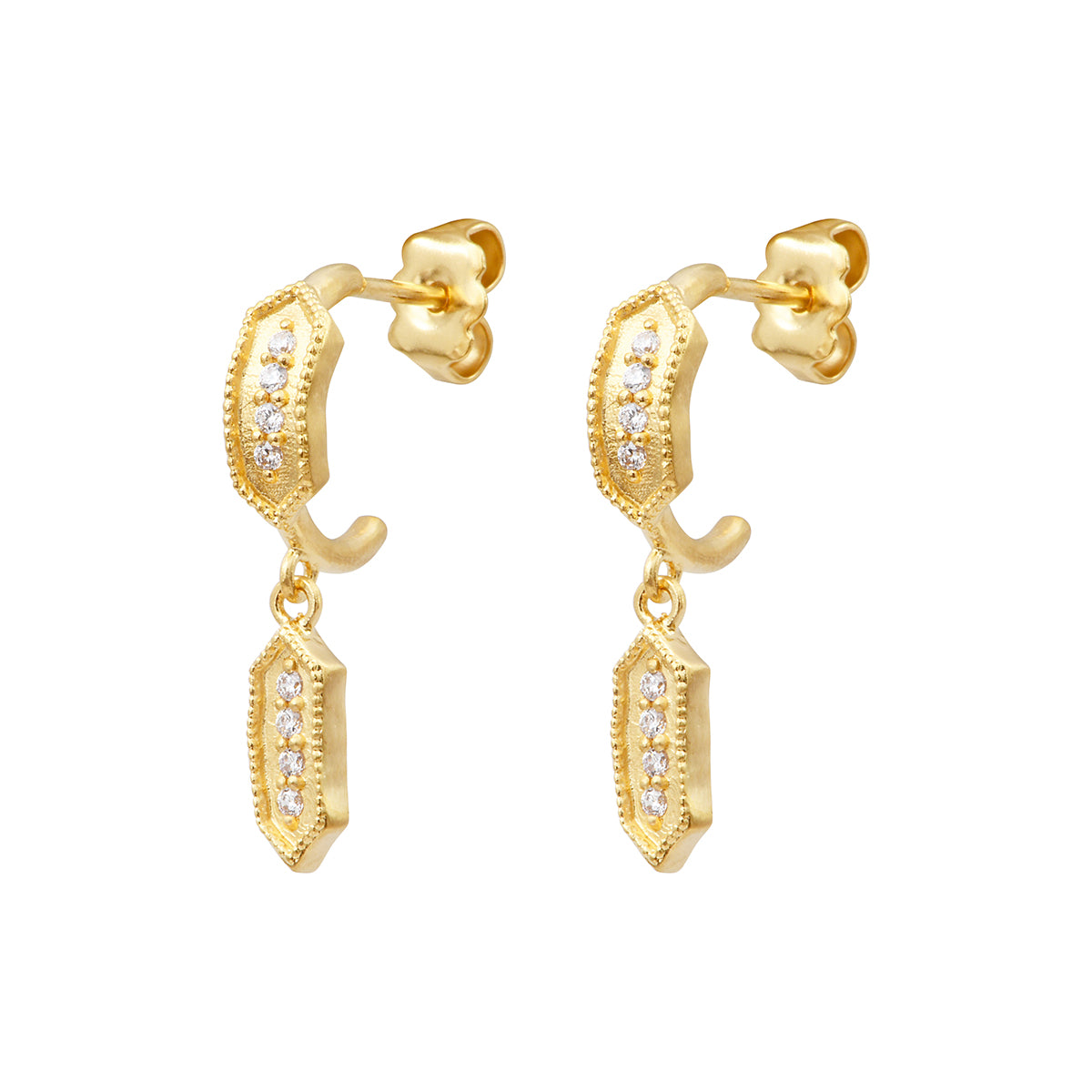 Créoles composées de 2 petits rectangles triangulaire de 1cm/0,3cm, le premier est soudé au corps de la créole et reprend la forme arrondie de celle-ci, le second est articulé et vient prolonger la créole. Les boucles sont dorées à l'or fin. 1,5cm de diamètre pour la créole, longueur totale avec le pendant: 2,8cm