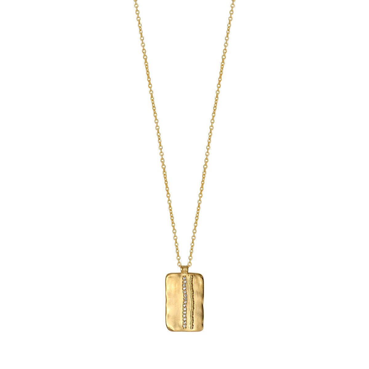 Collier médaille rectangulaire avec ses angles arrondis, pavé d’une ligne irrégulière de zircons blancs et de mini billes