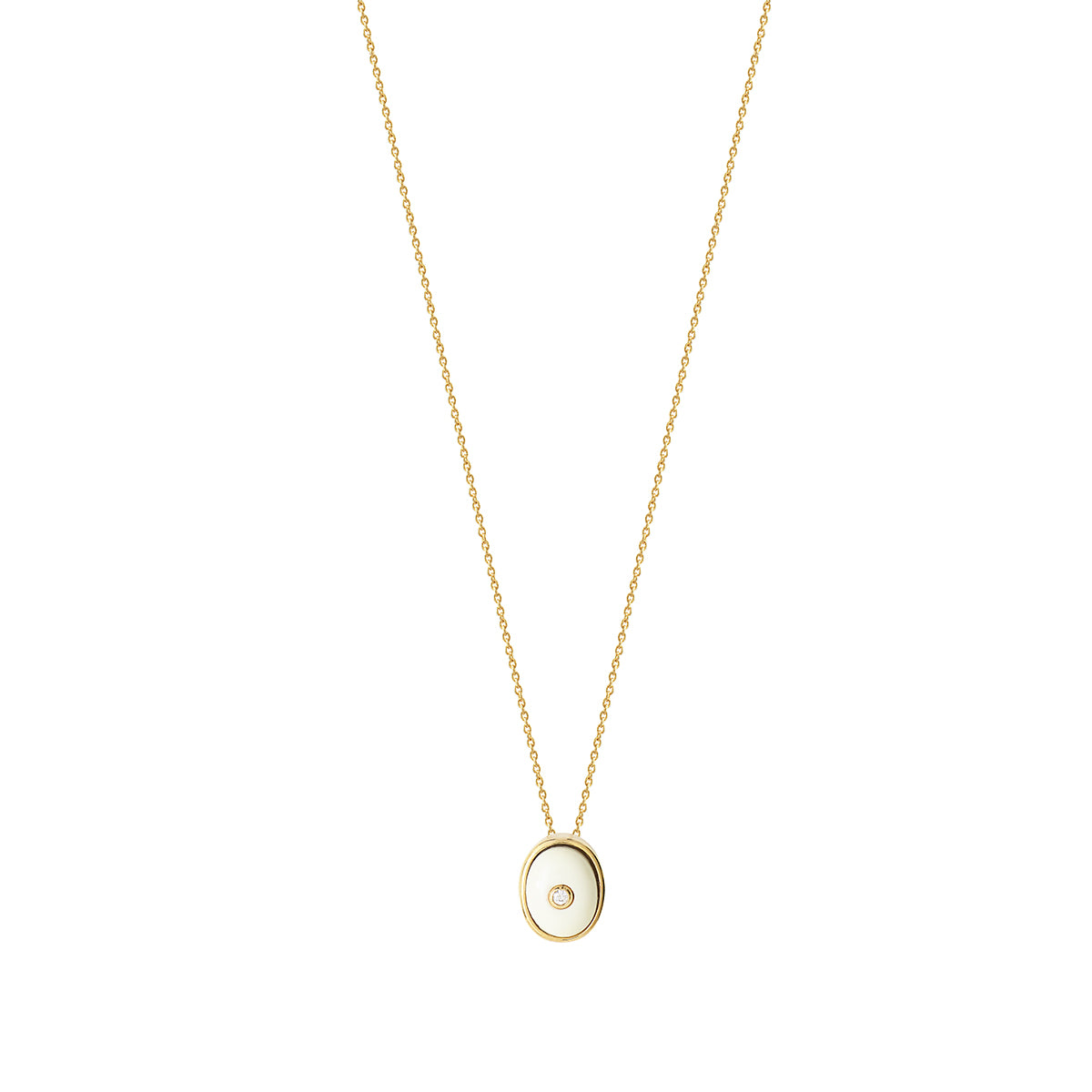 Ras du cou avec un pendentif en émail blanc incrusté d'un zircon blanc rond , délicatement monté sur un anneau en laiton recyclé or 18 Carats.