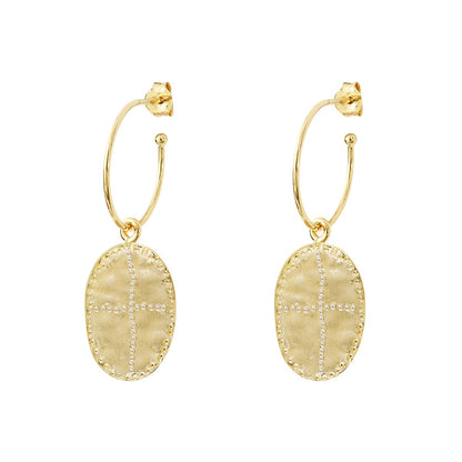 Créoles médailles embossées, serties de zircons blancs, brossées, mates et dorées à l'or fin.