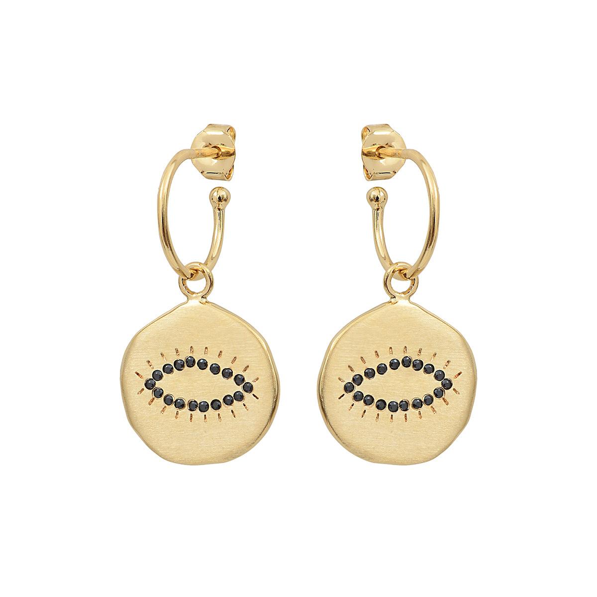 Créoles avec une médaille mate, striée et pavée d'un œil en zircons noir.